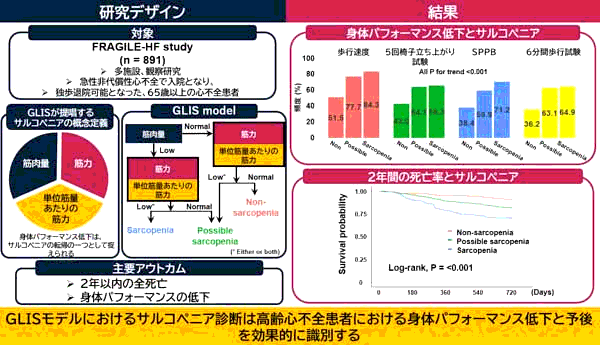 しかし、この新基準で診断されたサルコペニアが、果たして実際に身体パフォーマンスの低下や予後と関連するかどうかは検証されておらず、GLIS内部でも重要課題として残されていました。本研究では、高齢心不全患者を対象に、このGLISモデルによるサルコペニア診断が身体機能の低下や退院後の予後と関連するかを検討しました。