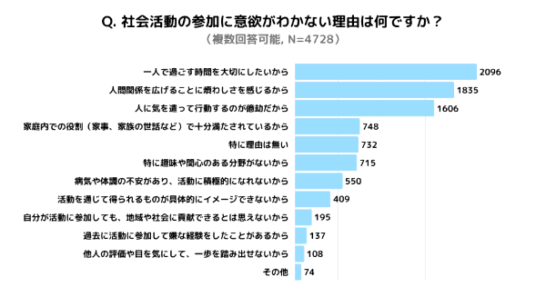 社会活動への参加意欲がわかない理由として、回答者が強く意識しているのは 人間関係に関する負担 と 個人的な時間配分 の問題でした。