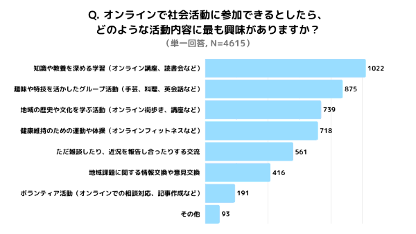 参加してみたいオンライン活動の形態として最も多かったのは、以下の通りです。