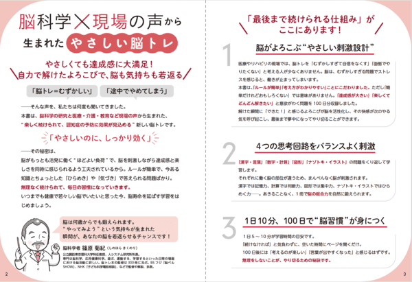 本書は、「脳トレはむずかしい」「めんどうで続かない」……、そんな現場や当事者の声を解決する、やさしい&続けられる脳トレドリルです。脳を刺激しながら達成感と楽しさを同時に感じられるよう工夫されているから、飽きずに100日間最後まで続けられます。簡単なルールとちょっとしたひらめきで解けるため、むずかしくて諦めることもありません。