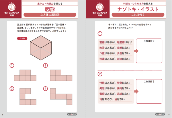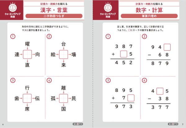 「漢字・言葉」「数字・計算」「図形」「ナゾトキ・イラスト」の問題をくり返し出題。漢字では記憶力、計算では判断力、図形では集中力、ナゾトキ・イラストでは発想力──。それぞれに働く脳の部位が違うため、あきることなく脳の総合力を自然に鍛えられます。