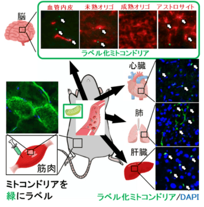 筋肉内のミトコンドリアを緑に標識し24時間後に評価したところ、各種臓器、脳に緑のシグナルを確認した。
