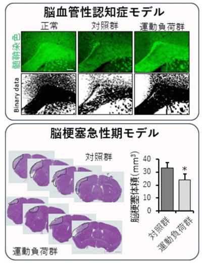 本研究では、マウスを用いた慢性脳低灌流モデル*3(白質障害・認知機能障害モデル)および急性脳梗塞モデルを用い、低強度のトレッドミル運動が脳虚血に与える影響を検討しました。